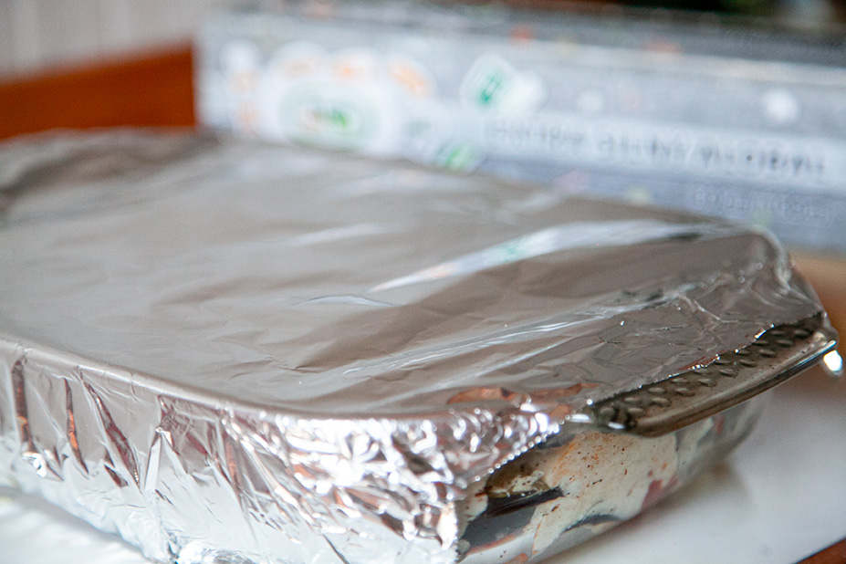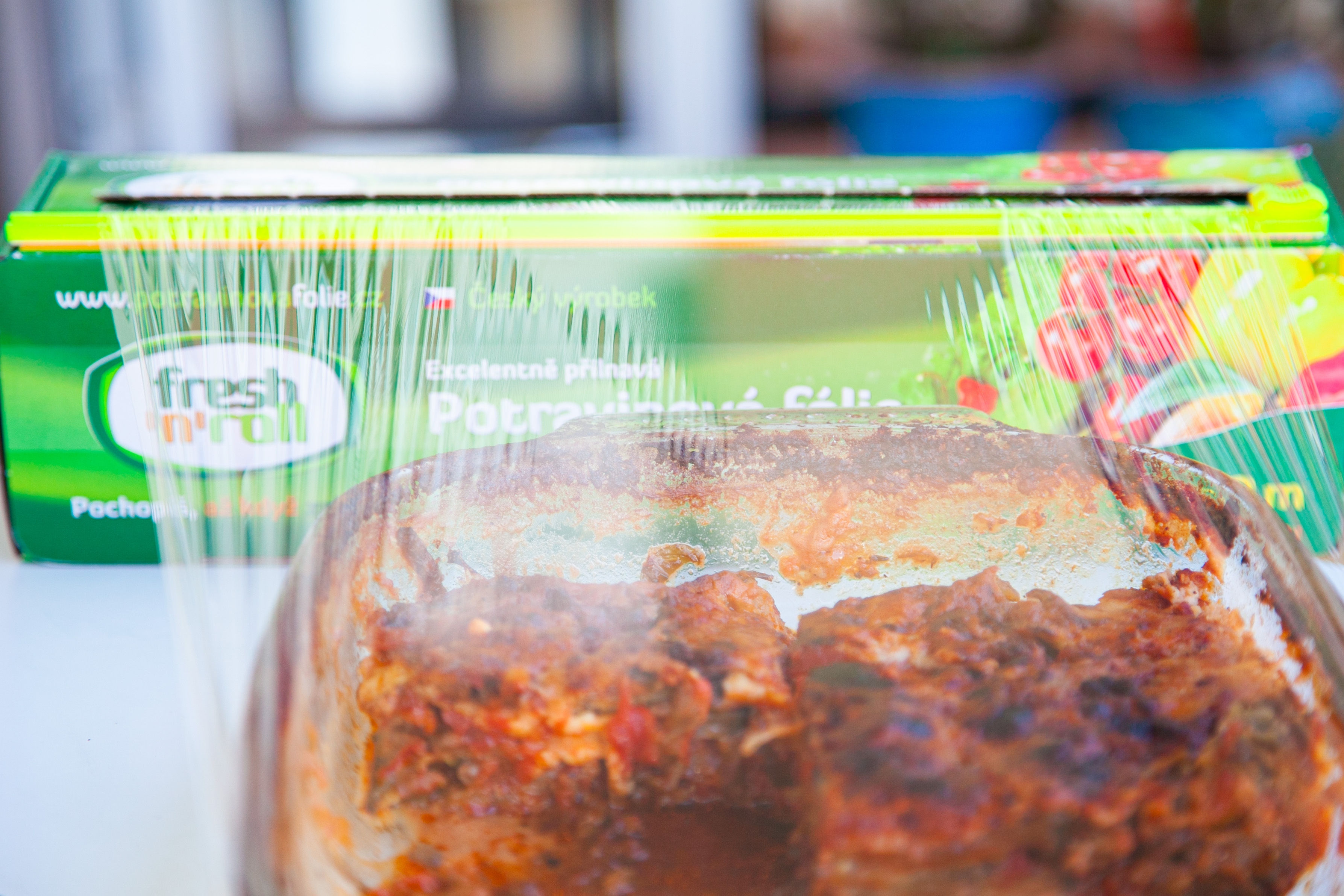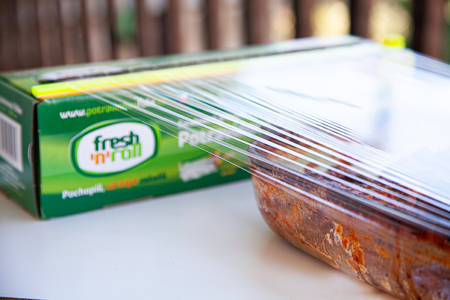 Potravinovovou fólii Fresh'n'Roll (pro menší pekáč, jako byl ten náš štačí 30 cm / 100 nebo 300 m, pokud máte pekáč větší, bude se vám hodit širší verze fólie 45 cm / 300 m)