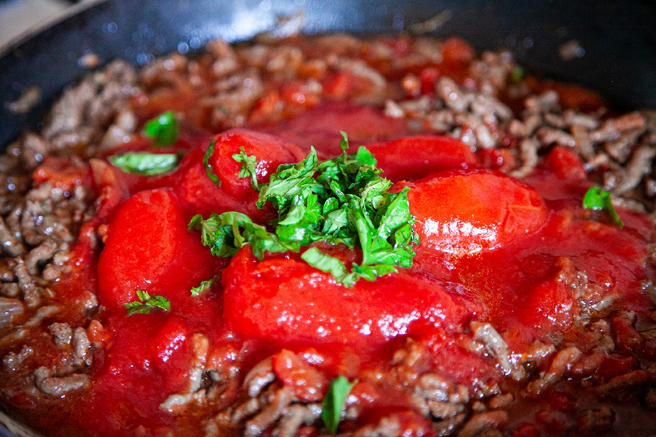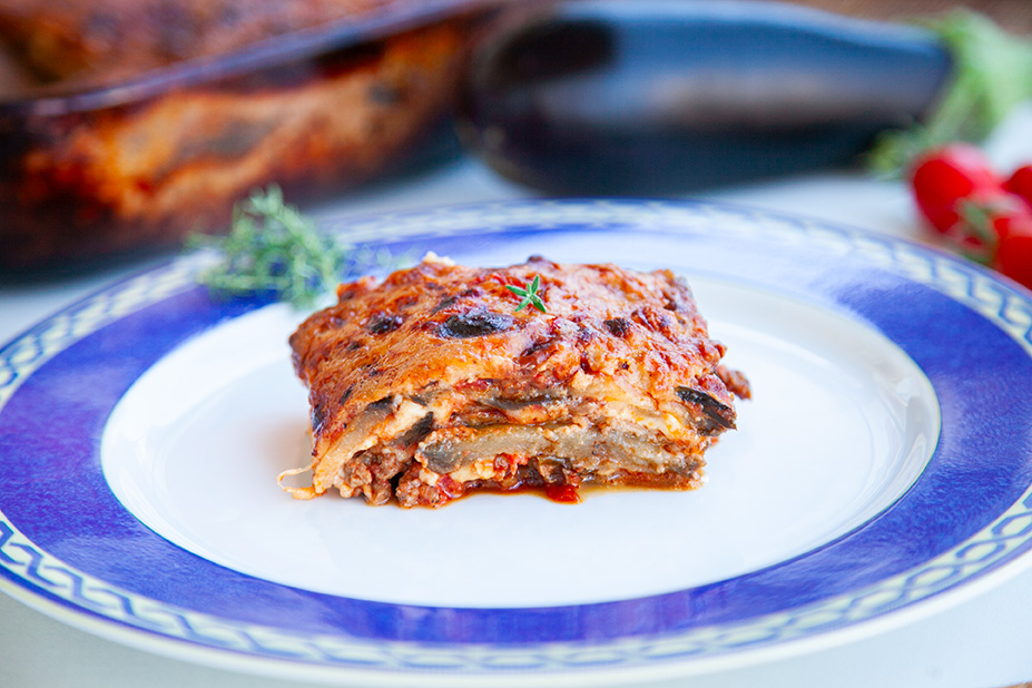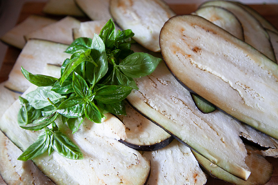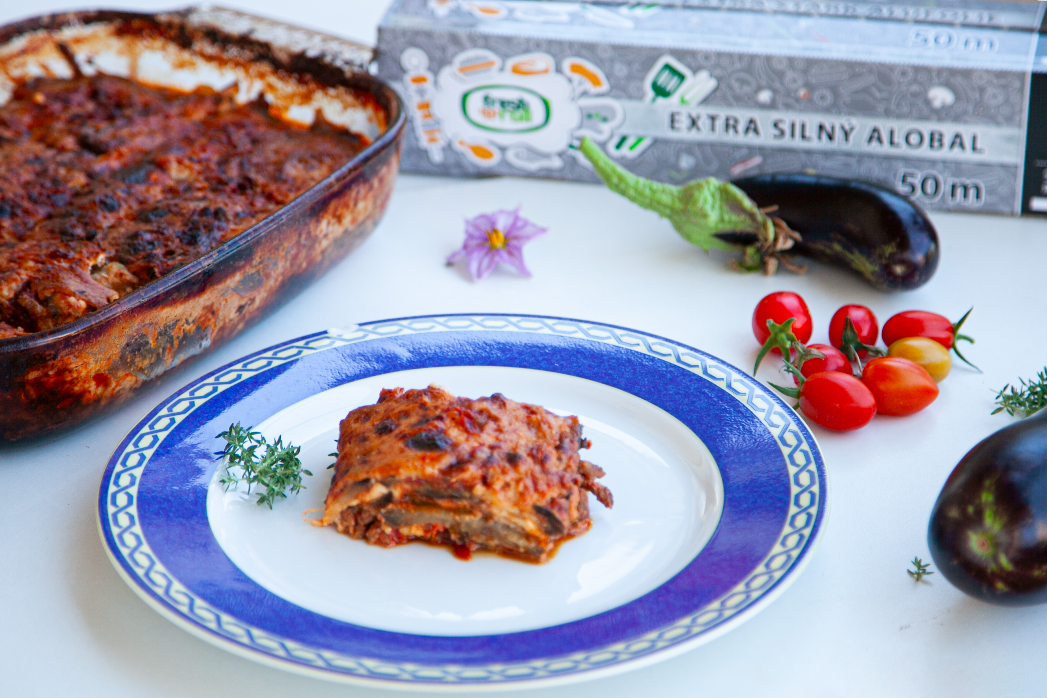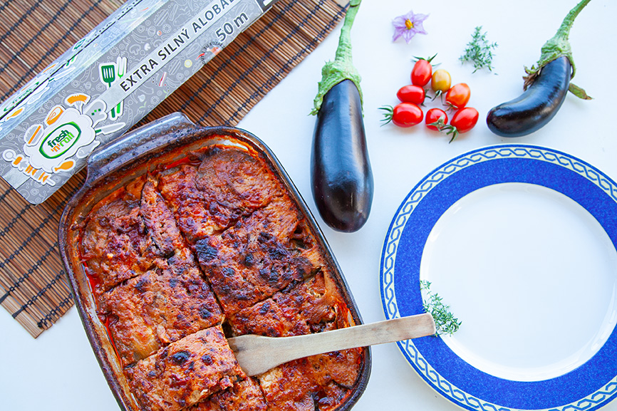 Ze všeho nejdříve si nakrájíme lilky na tenčí plátky a posypeme je solí. Sůl nám z lilků vytáhne vodu. Necháme ji cca 30 minut působit a vrhneme se na přípravu masovo-rajčatové směsi. Na rozehřátou pánev nalijeme trochu olivového olejte a přidáme mleté hověží maso (pokud nemáte hověží klidně použijte vepřové). Restujeme cca 10 min a poté přidáme konzervovaná rajčata. Promícháme, přidáme tymián, bazalku a 3 stroužky česneku a restujeme dalších 15 min nebo dokud směs nezkoustne. Vrátíme se zpátky k posolenému lilku. Lilek pořádně osušíme (např. papírovými ubrousky). Nachystáme si pekáč a vrstvíme: nejdříve 1 vrstvu lilkových plátků, potom 1 naběračku masové omáčky, posypeme parmazánem, vyskládáme plátky mozarelly, položíme lístky bazalky a takto pokračujeme, dokud nemáme pekáč plný. Teď nám zbývá připravit bešamelovou omáčku. Na rozehřáté pánvi necháme roztát máslo, poprášíme moukou a necháme zezlátnout. Za stálého míchání přidáváme mléko. Jakmile má bešamel konzistenci omáčky, přidáme hrst (cca 100 g) parmazánu. Pak přidáme sůl, pepř a muškátový oříšek. Vyskládaný pekáč zalijeme bešamelem, a pokud nám zbylo trochu parmazánu, posypeme parmazánem. Zafólijujeme alobalem Fresh'n'Roll a necháme péct 40 min přikryté. Potom dalších 15 min bez alobalu. Pečeme na cca 200 stupňů.