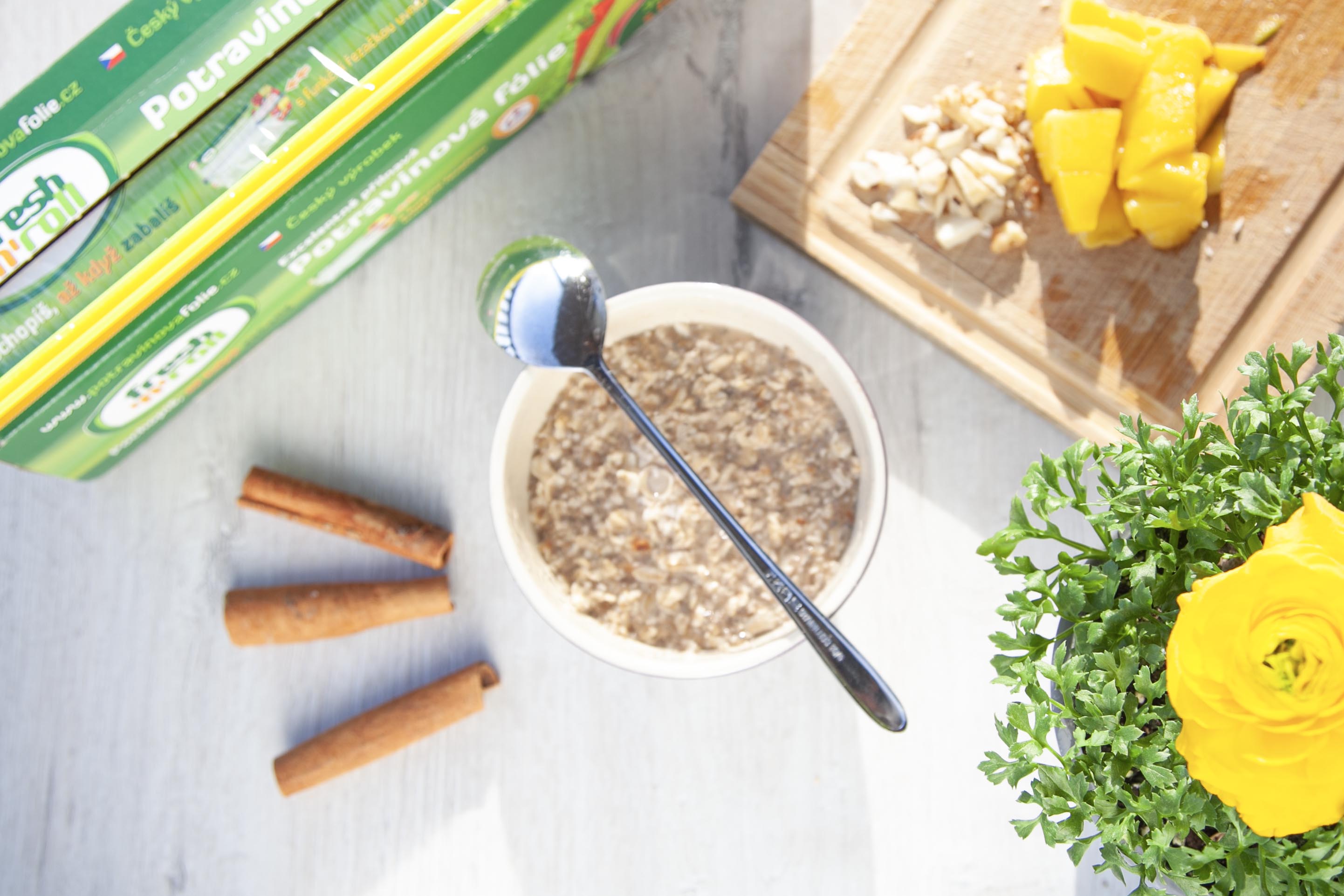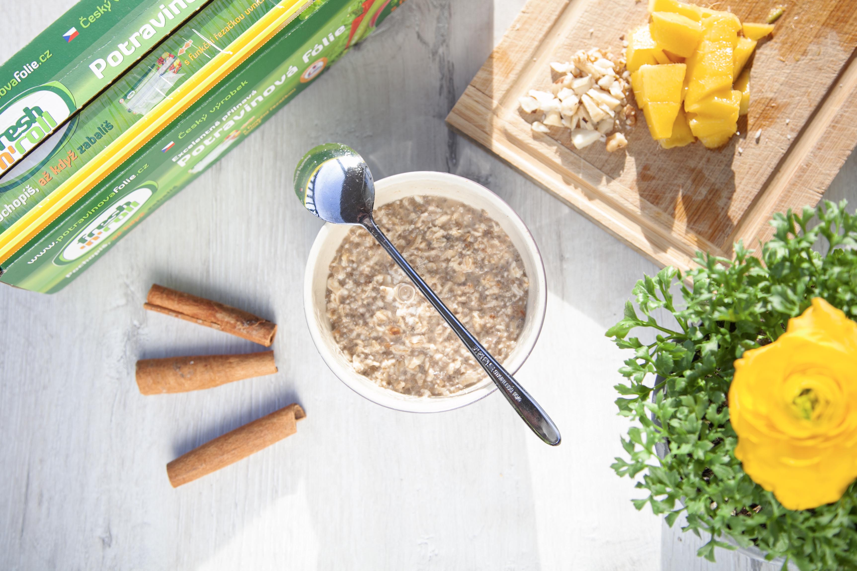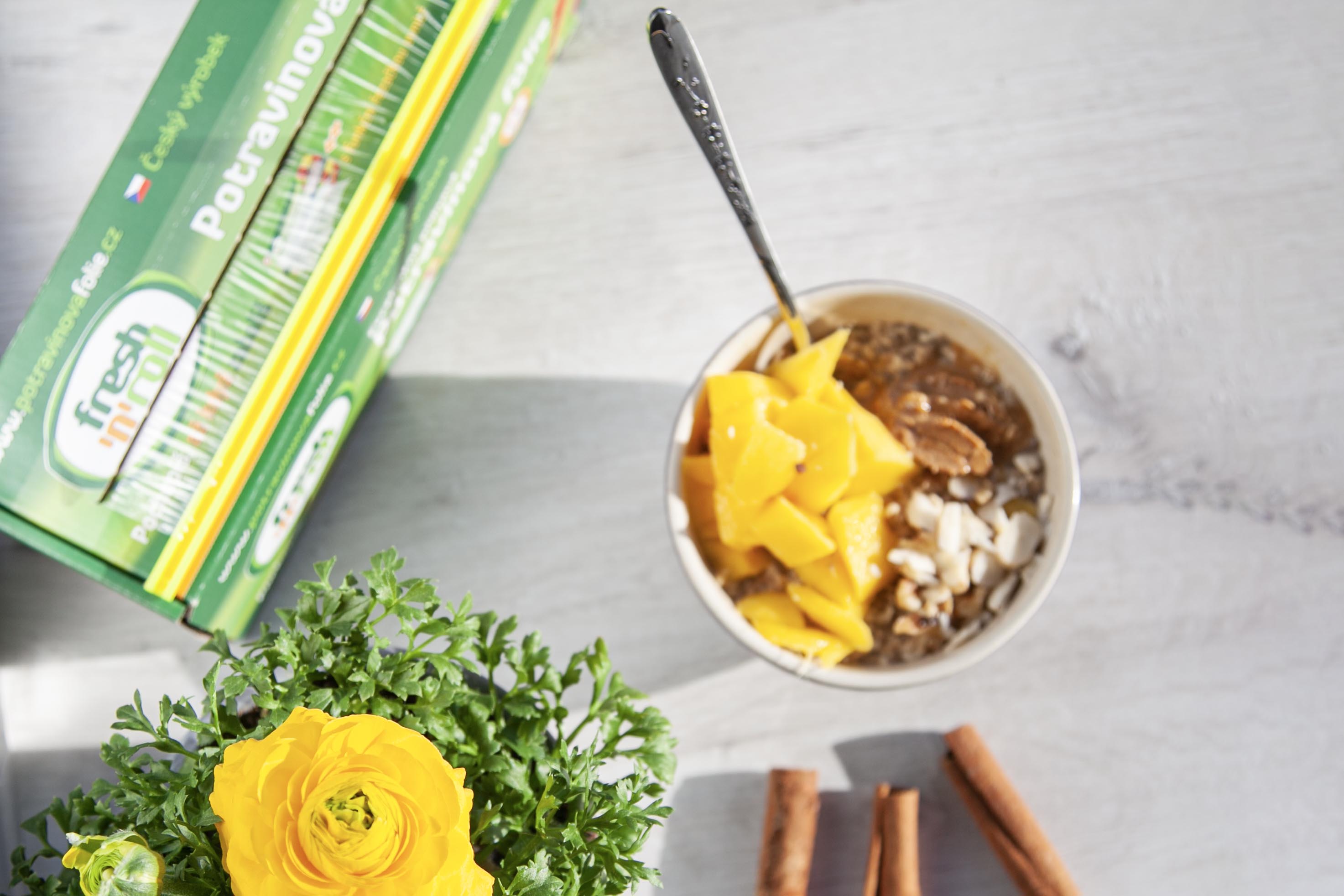 Nejdříve si ovesné vločky s chia semínky, skořicí a oříškovým máslem přichystáme do misky. Zalejeme vroucí vodou a pořádně promícháme. Misku zakryjeme fólií Fresh’n’Roll a čekáme 4 až 8 minut. Fólie Fresh’n’Roll skvěle přilne k povrchu misky a v podstatě v páře dovaří ovesné vločky. Během čekání navíc můžeme sledovat, jak skvěle funguje systém antifog na fólii Fresh’n’Roll. Počáteční zamlžení za chvíli zmizí a fólie je čirá. Jakmile uvidíme, že vločky absorbovaly vodu, přidáme čerstvé ovoce, nasekané oříšky a pro milovníky oříškových másel ještě jednu lžíci oříškového másla.