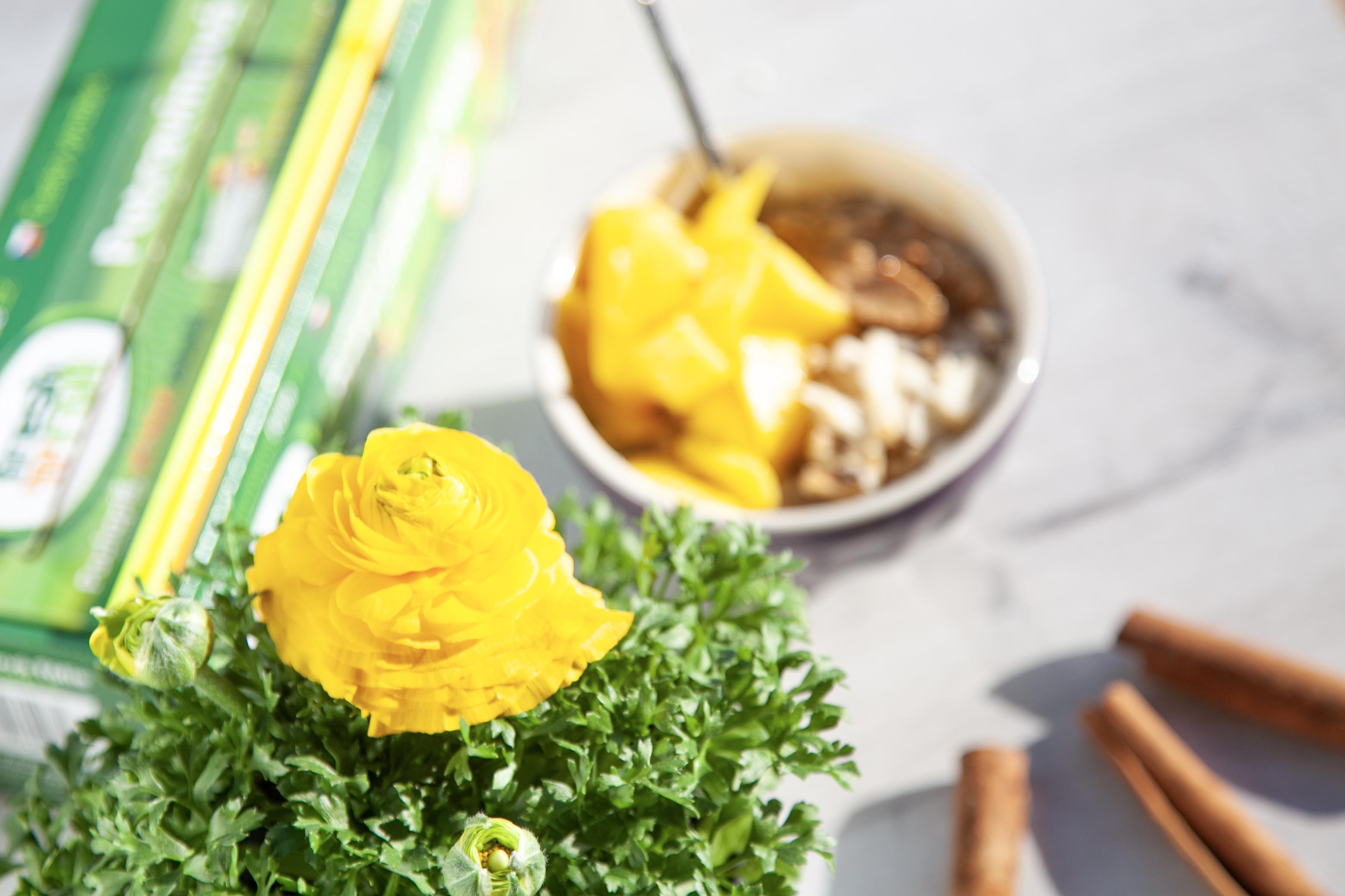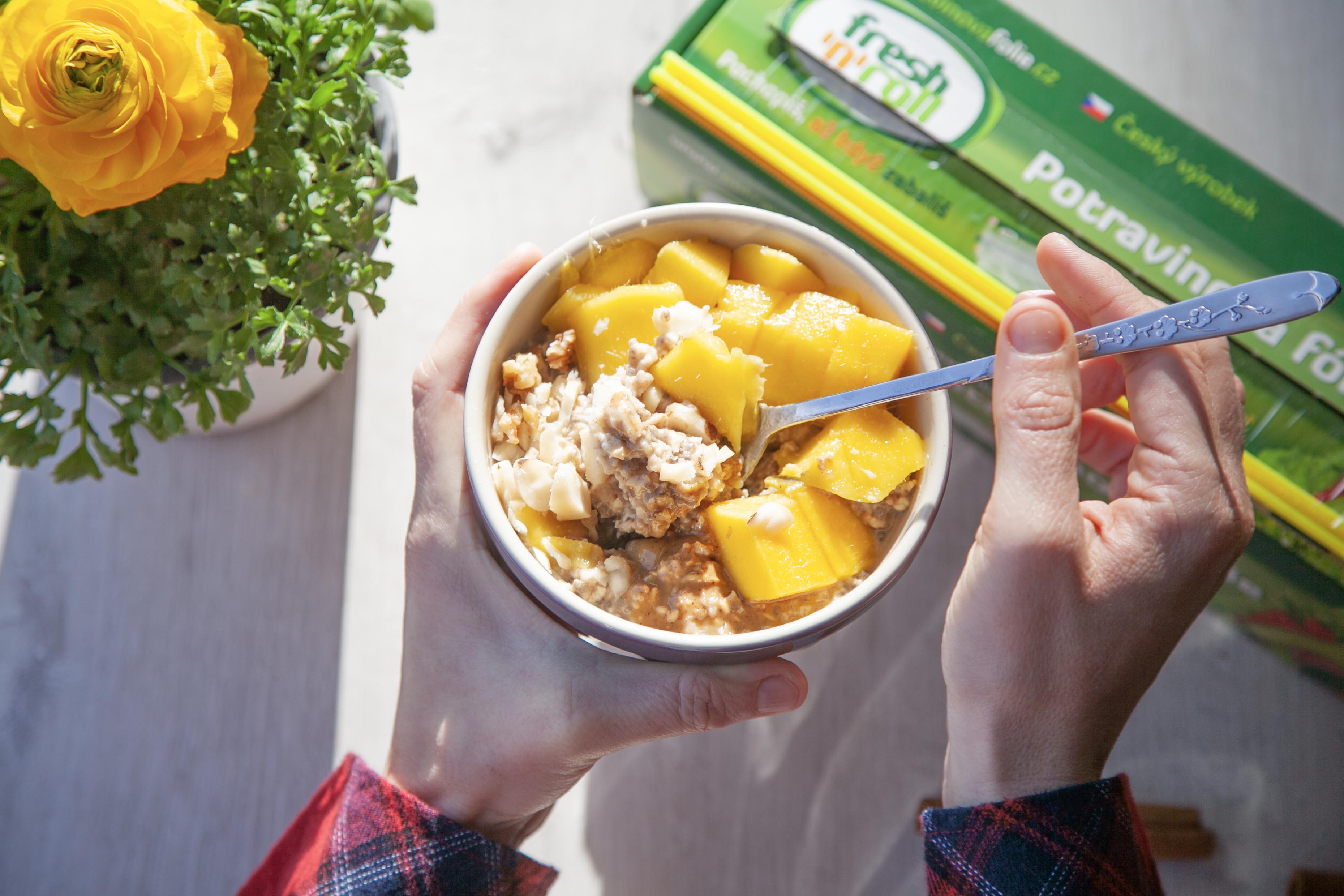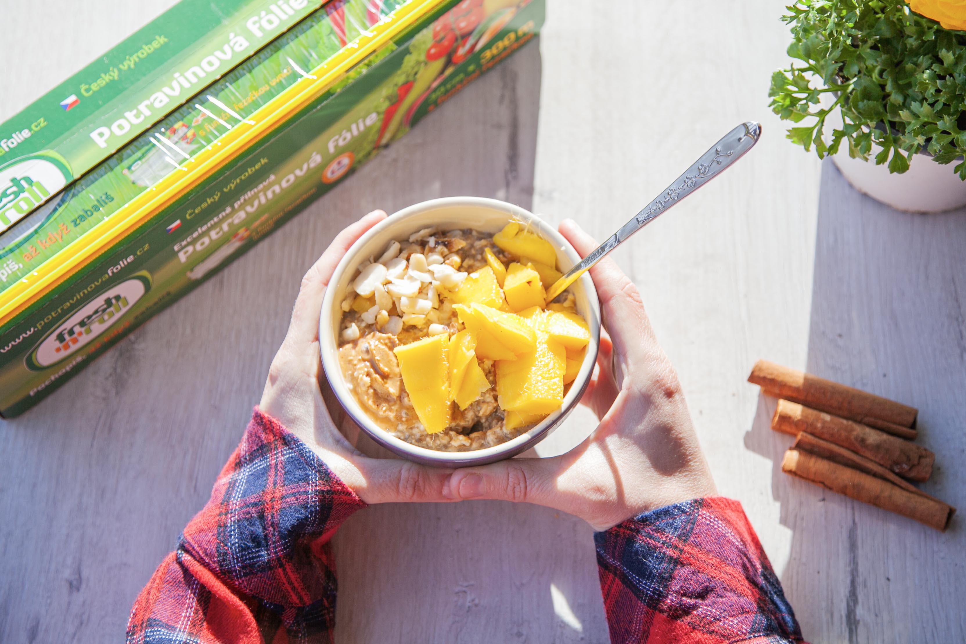 Nejdříve si ovesné vločky s chia semínky, skořicí a oříškovým máslem přichystáme do misky. Zalejeme vroucí vodou a pořádně promícháme. Misku zakryjeme fólií Fresh’n’Roll a čekáme 4 až 8 minut. Fólie Fresh’n’Roll skvěle přilne k povrchu misky a v podstatě v páře dovaří ovesné vločky. Během čekání navíc můžeme sledovat, jak skvěle funguje systém antifog na fólii Fresh’n’Roll. Počáteční zamlžení za chvíli zmizí a fólie je čirá. Jakmile uvidíme, že vločky absorbovaly vodu, přidáme čerstvé ovoce, nasekané oříšky a pro milovníky oříškových másel ještě jednu lžíci oříškového másla.