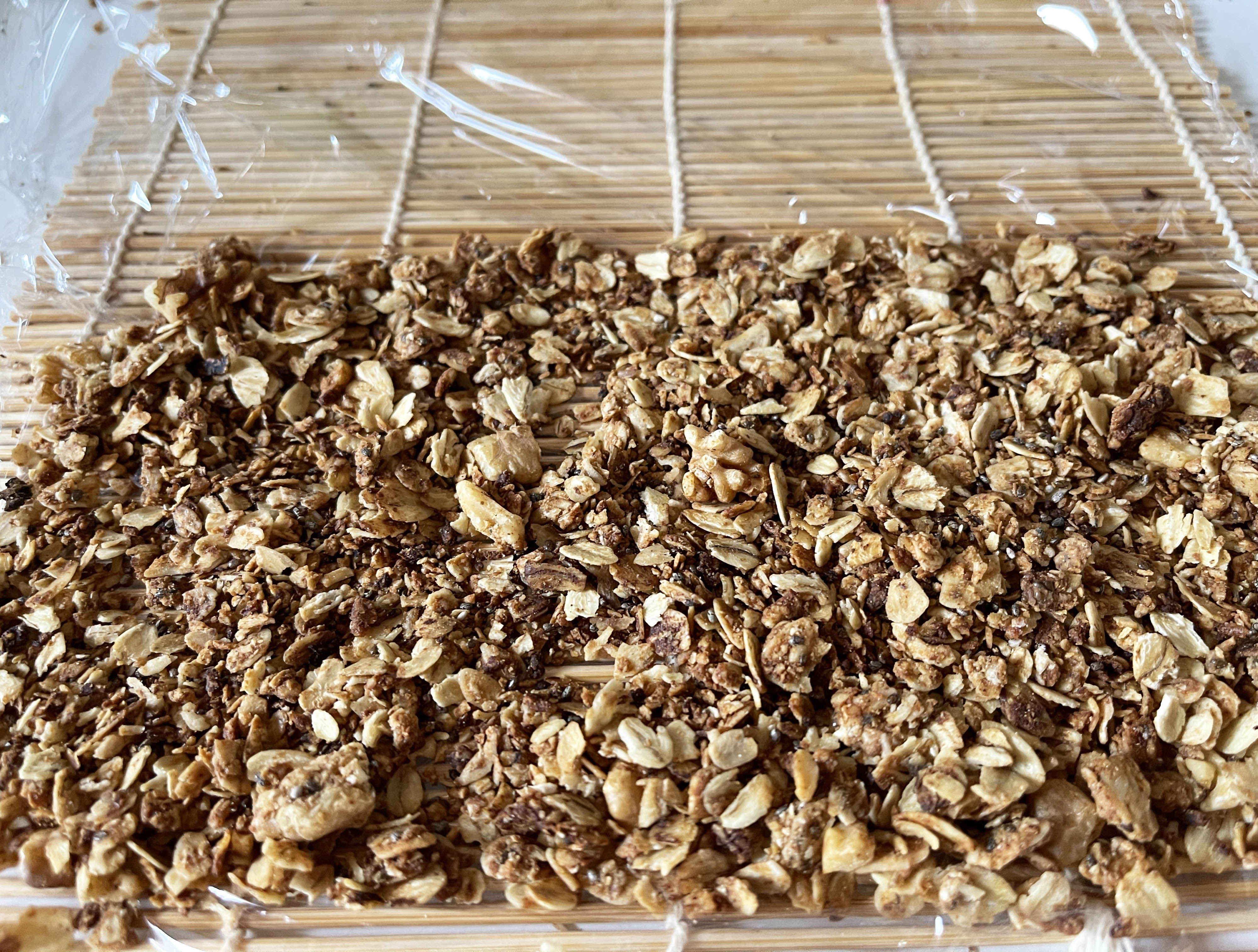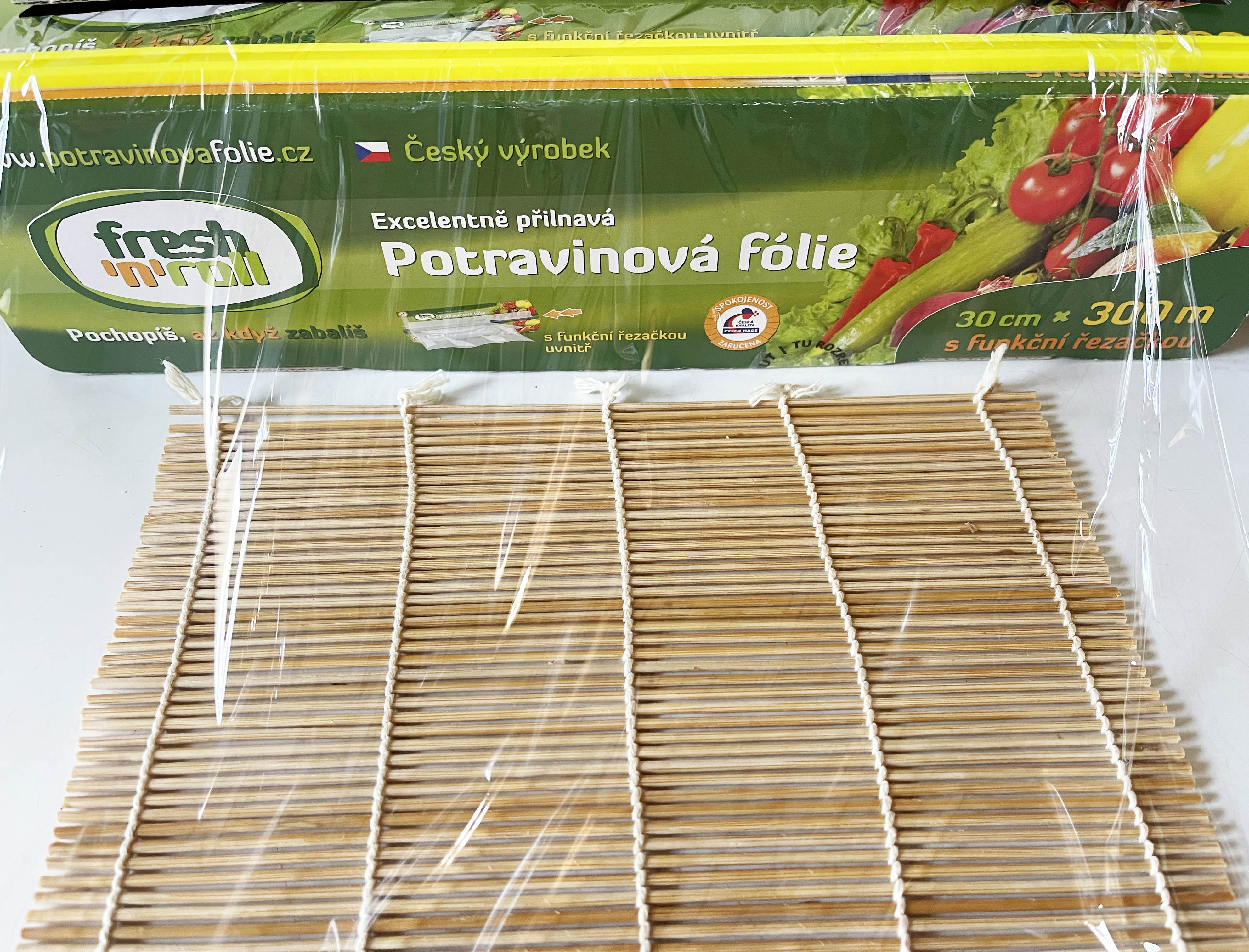 Ze všeho nejdříve si ve vodní lázni nebo v mikrovlnné troubě necháme rozměknout mandlové máslo (pokud nemáte madlové, můžete vyzkoušet i s jinými tipy ořechových másel). Na pracovní stůl si připravíme bambusovou podložku na sushi a na ni položíme fólii Fresh’n’Roll. Na 1/3 rozprostřeme tenkou vrstvu granoly. Banán nebo jahody namočíme do mandlového másla a položíme je na vrstvu granoly. A potom rolujeme, tak jako byste rolovali sushi. Rolku nezapomeňte pořádně utáhnout, aby se granola co nejlépe přilepila na mandlové máslo. Na chvíli necháme odpočinout v lednici a před servírováním nakrájíme na cca 3 cm hrubé kousky.