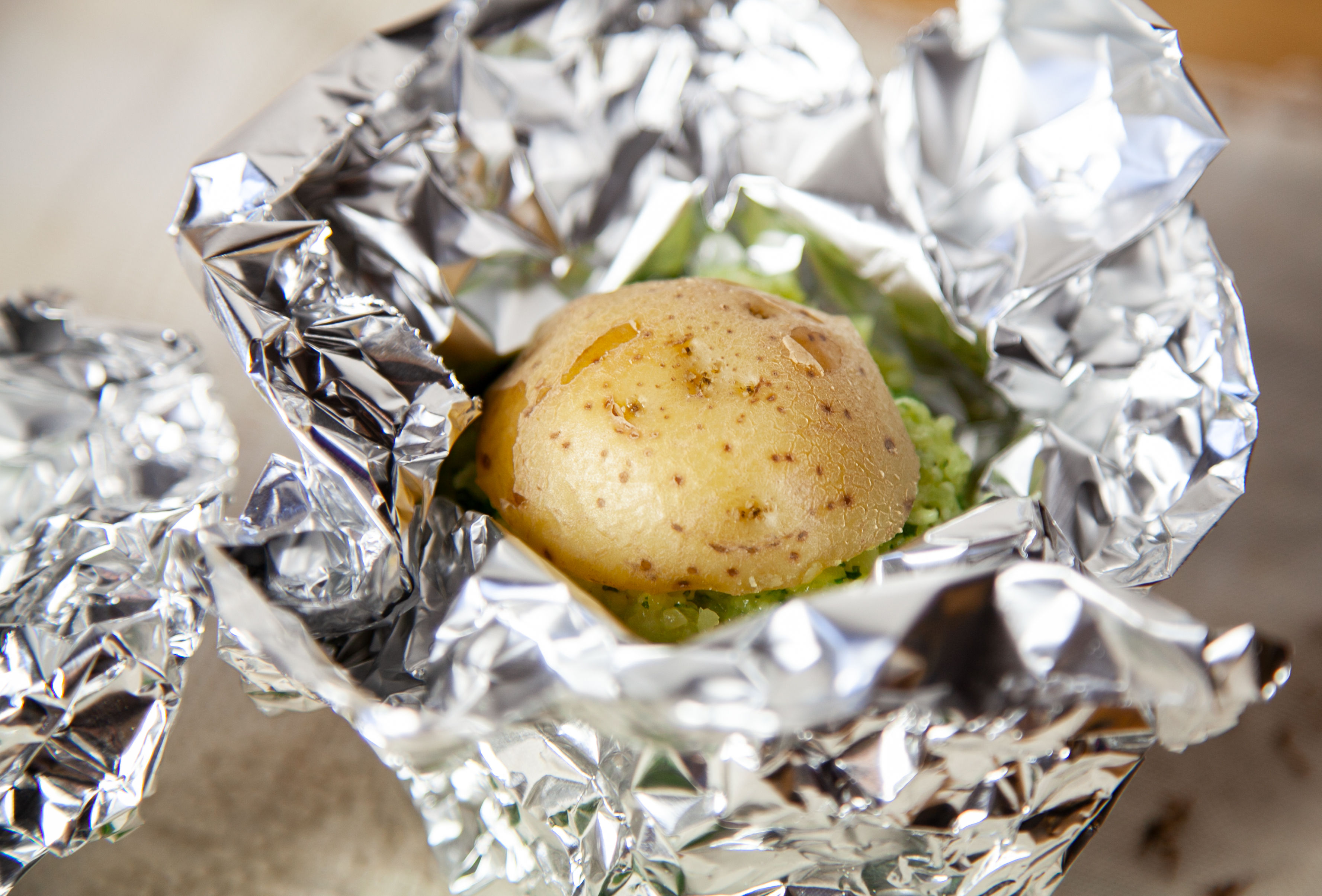 Ze všeho nejdříve si brambory uvaříme do poloměka. Necháme je vychladnout. Potom odkrojíme horní část brambory a vydlabeme lžící vnitřek brambory. Vytvoříme tak něco jako bramborovu misku. Uvařený vnitřek brambory smícháme s jemně nastrouhaným tvrdým sýrem a bylinkami. Celou směs dochutíme solí a pepřem. Bramborovo-sýrovou směsí vyplníme vydlabané brambory. Zakápneme olivovým olejtem a přikryjeme odříznutou horní částí brambory. Vložíme do alobalu a dáme péct na 200°C cca na 20 min nebo až uvidíme, že je brambora zlatavá. Bramboru můžete jíst jako hlavní chod nebo jako přílohu k pečenému či grilovanému masu.