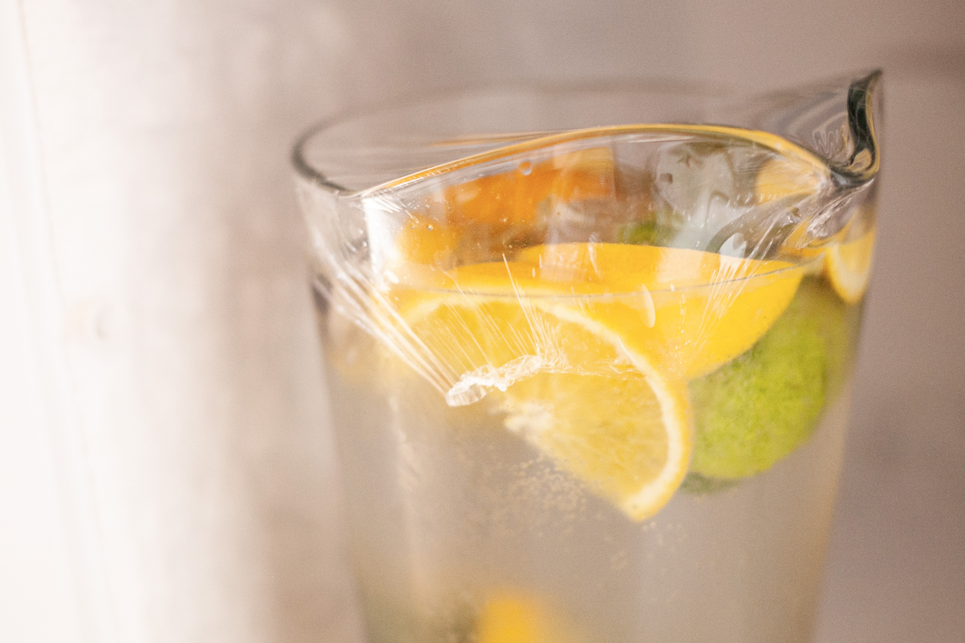 Věděli jste, že fólie Fresh'n'Roll je testována až do -40 °C? Tuto vlastnosti oceníte ne jen při zamražování masa, ale taky při chlazení nápojů. Do skleněné nádoby na vodu dáme led, citrusové ovoce, mátu a vše jsme zalijeme perlivou vodou a překryjeme fólií Fresh'n'Roll. Nádobu dáme do mrazáku a vytáhneme až bude nápoj krásně vychlazený.